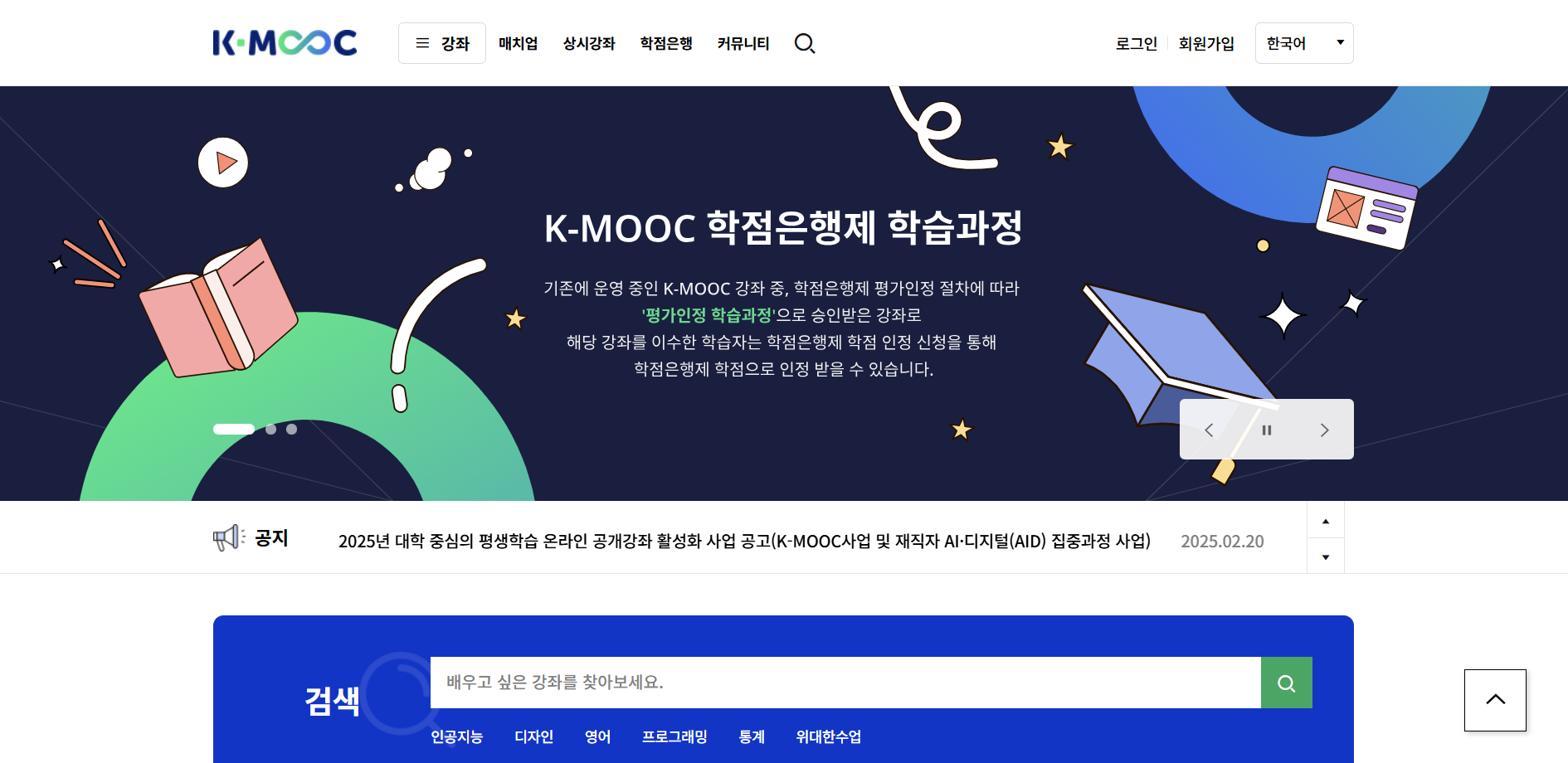 인문학, 사회과학, 자연과학 등 대학 수준의 강의를 무료로 제공하는 곳이 바로 K-MOOC예요! 📚 국내외 전문가들이 강의를 진행해서, 마치 대학 강의를 듣는 듯한 퀄리티를 자랑해요. 정식 대학 강의를 부담 없이 듣고 싶다면? 지금 바로 K-MOOC를 활용해 보세요!