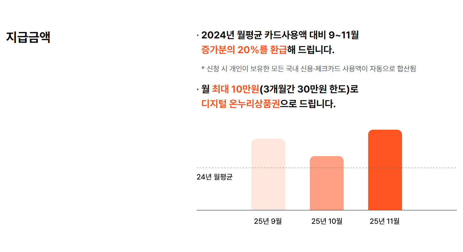 2024년 월평균 카드사용액 대비 9~11월 증가분의 20%를 환급해 드립니다.