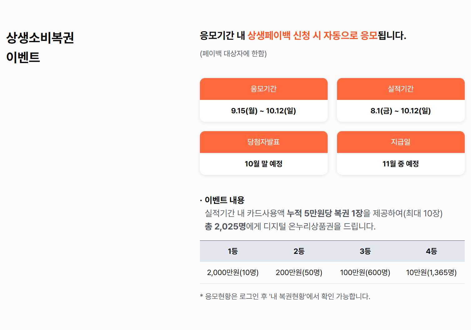 응모기간 내 상생페이백 신청 시 자동으로 응모됩니다.