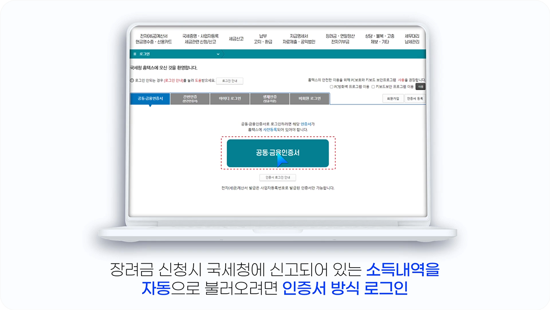 국세청에 신고되어 있는 소득내역을 자동으로 불러오려면 인증서 방식으로 로그인하셔야 합니다.
