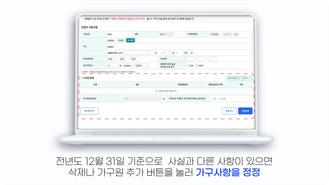 다음은 가구사항 화면입니다. 인증서로 로그인한 경우라면 기본적인 가구 사항은 채워져 있습니다. 전년도 12월 31일 기준으로 사실과 다른 사항이 있으면 삭제나 가구원 추가 버튼을 눌러 가구원을 정정하시면 됩니다.