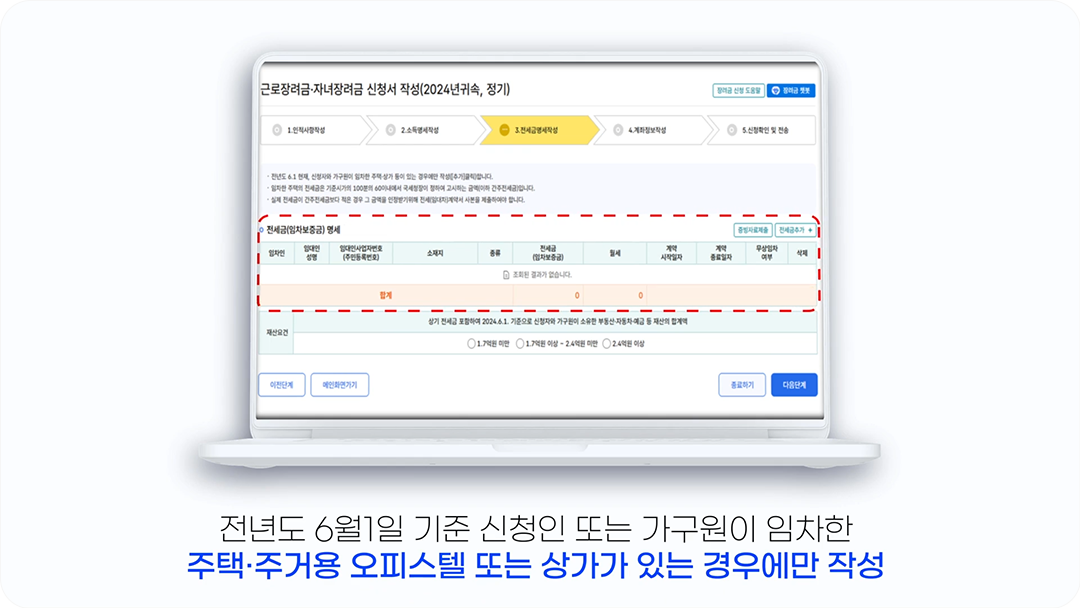 둘째, 상가 임차보증금은 실제 지급한 보증금으로 평가하므로 임대차 계약서 등으로 확인된 전세금 명세를 입력한 후 관련 증빙자료도 함께 제출해 주세요.
