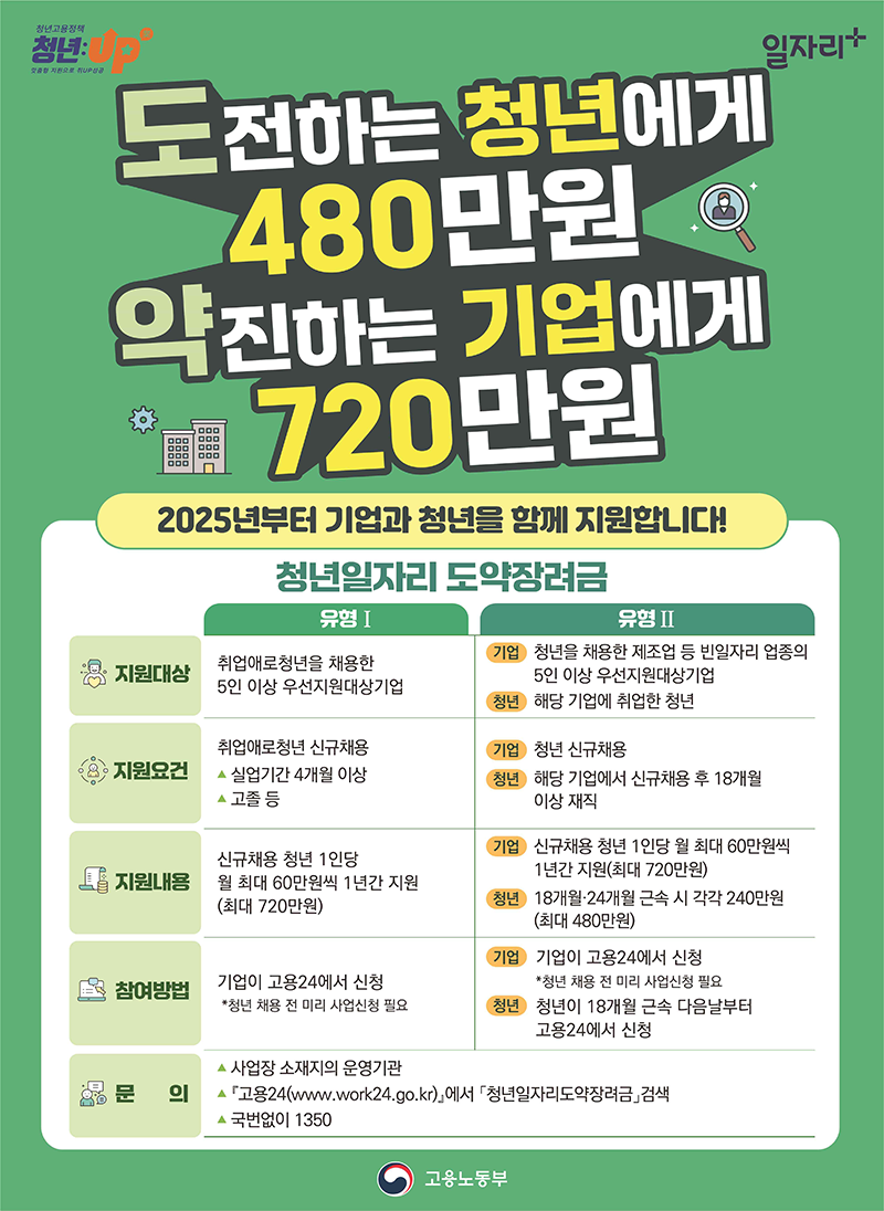 - 유형Ⅱ(신설): 제조업 등 10개 빈일자리 업종의 기업이 청년을 정규직으로 채용 후 6개월 이상 고용 유지 시, 기업에 1년간 최대 720만 원 지원. 해당 청년이 18개월 이상 재직하면 청년 본인에게도 최대 480만 원(18개월·24개월 각 240만 원) 지원